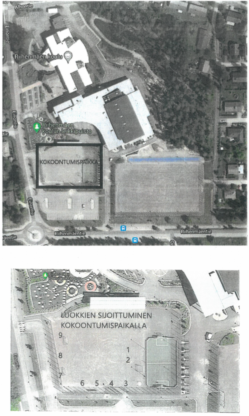 Siirrytään hälytyksen kuultua välituntipihan hiekkakentälle oman opetusryhmän opettajan luokse. Mikäli hälytys tulee välitunnilla, siirrytään hiekkakentälle välituntia seuraavan oppitunnin opettajan luokse.